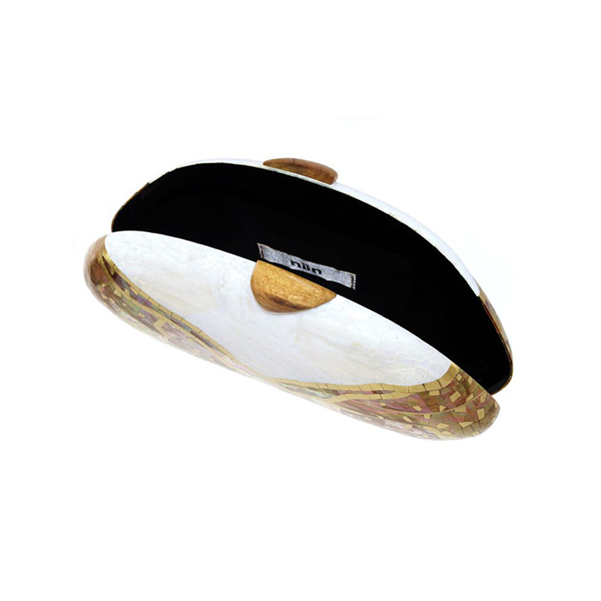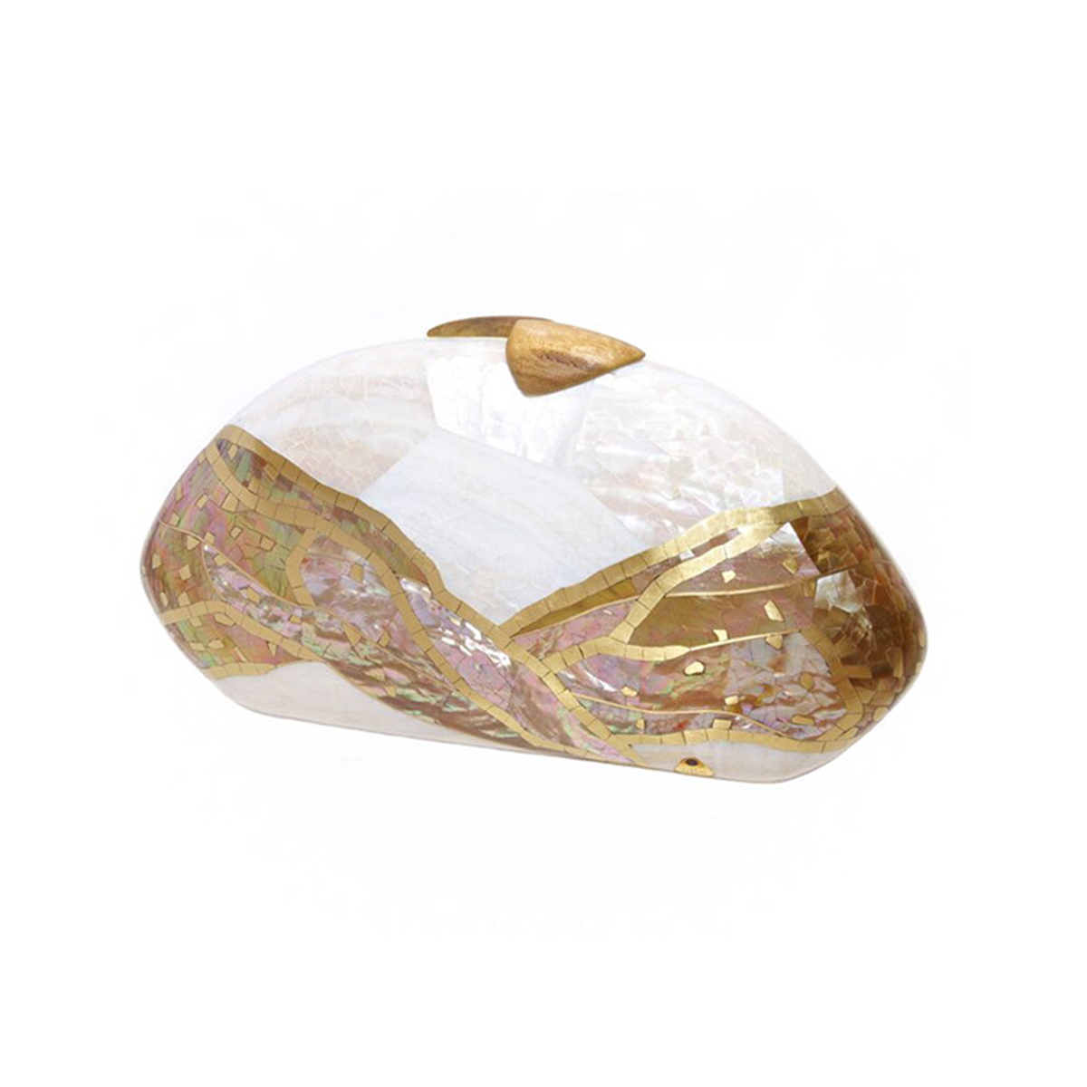 A work of art in itself, this inlaid shell clutch made of mother of pearl and brass is beautiful and chic. Wear it to complete your evening look.