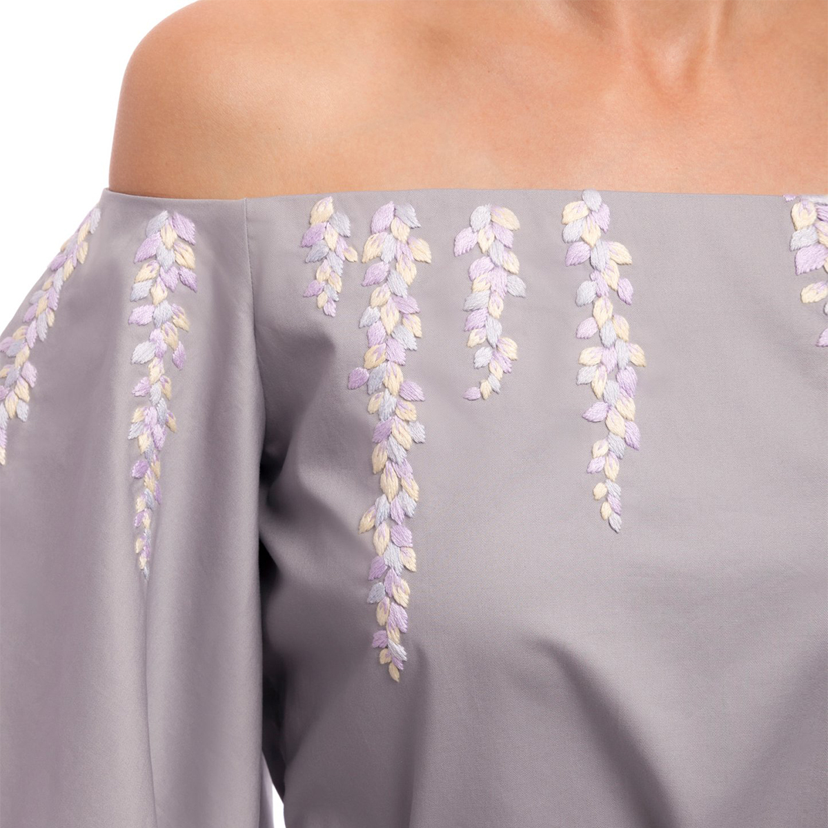 This hand embroidered, off the shoulder top is all understated glamour. Wear yours with wide legged trousers for an elegant, appropriate and unashamedly feminine look.