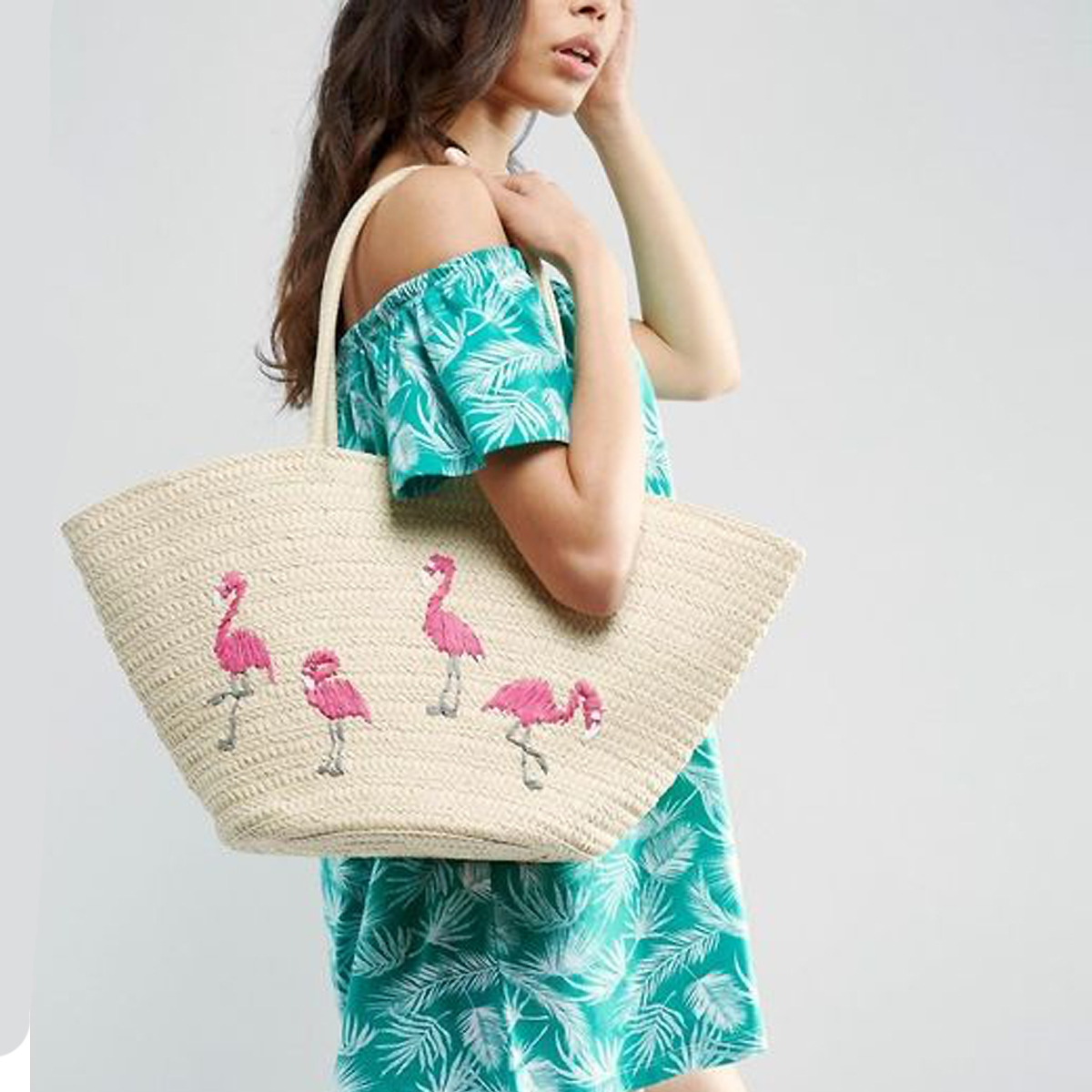Featuring pink flamingos and an easy, long handled shape, this basket will translate well from beach to city.
