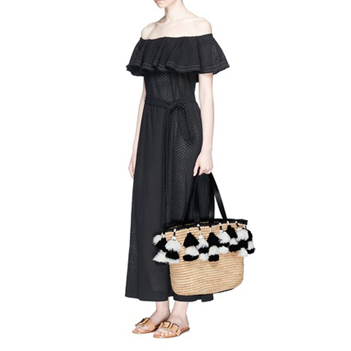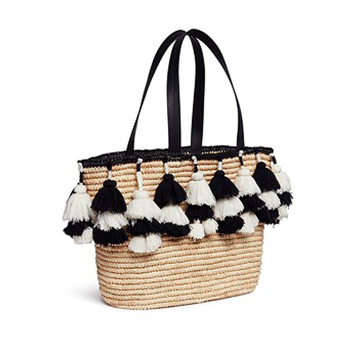 We love this basket by Alice & Olivia. It is boho and beachy, yet its monochrome colourway keeps it sleek and chic. We would wear ours with a black dress and tan sandals.