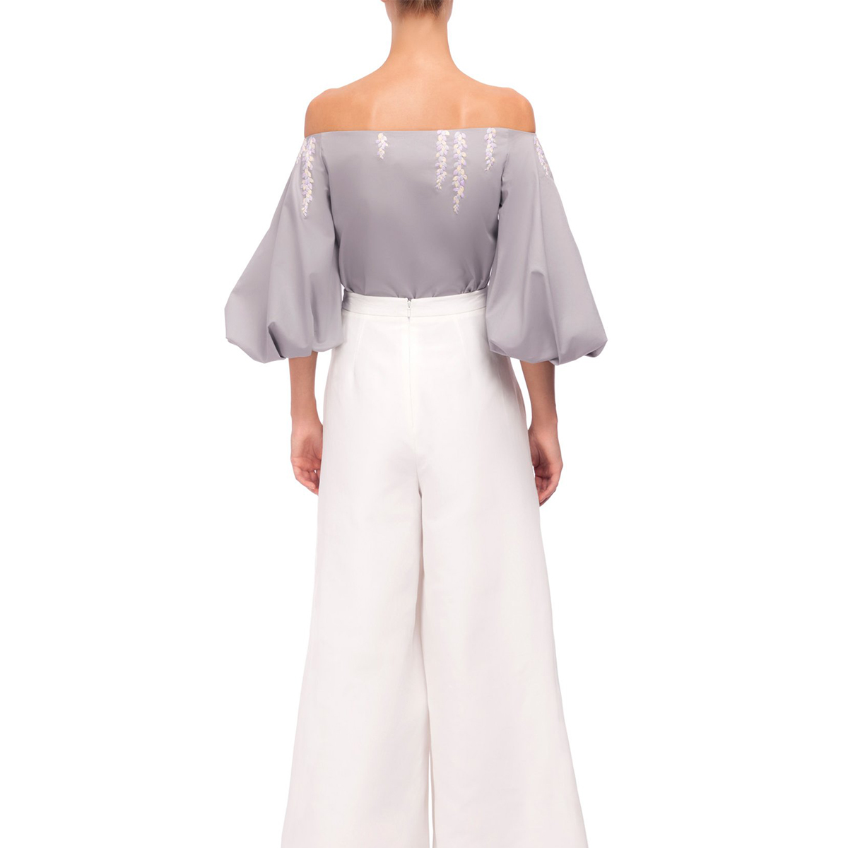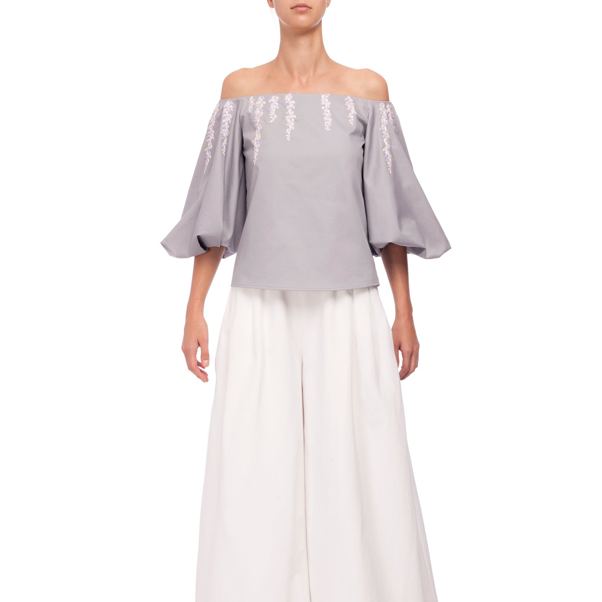 This hand embroidered, off the shoulder top is all understated glamour. Wear yours with wide legged trousers for an elegant, appropriate and unashamedly feminine look.