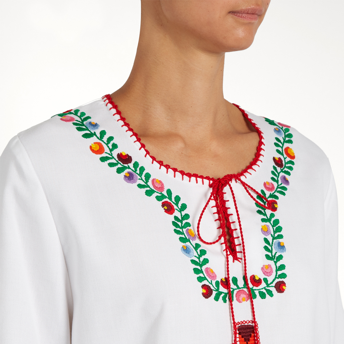 Embroidery, tassels and flowers all adorn this beautiful kaftan. Wear yours with simple tan sandals and a basket for an easy yet elegant look.