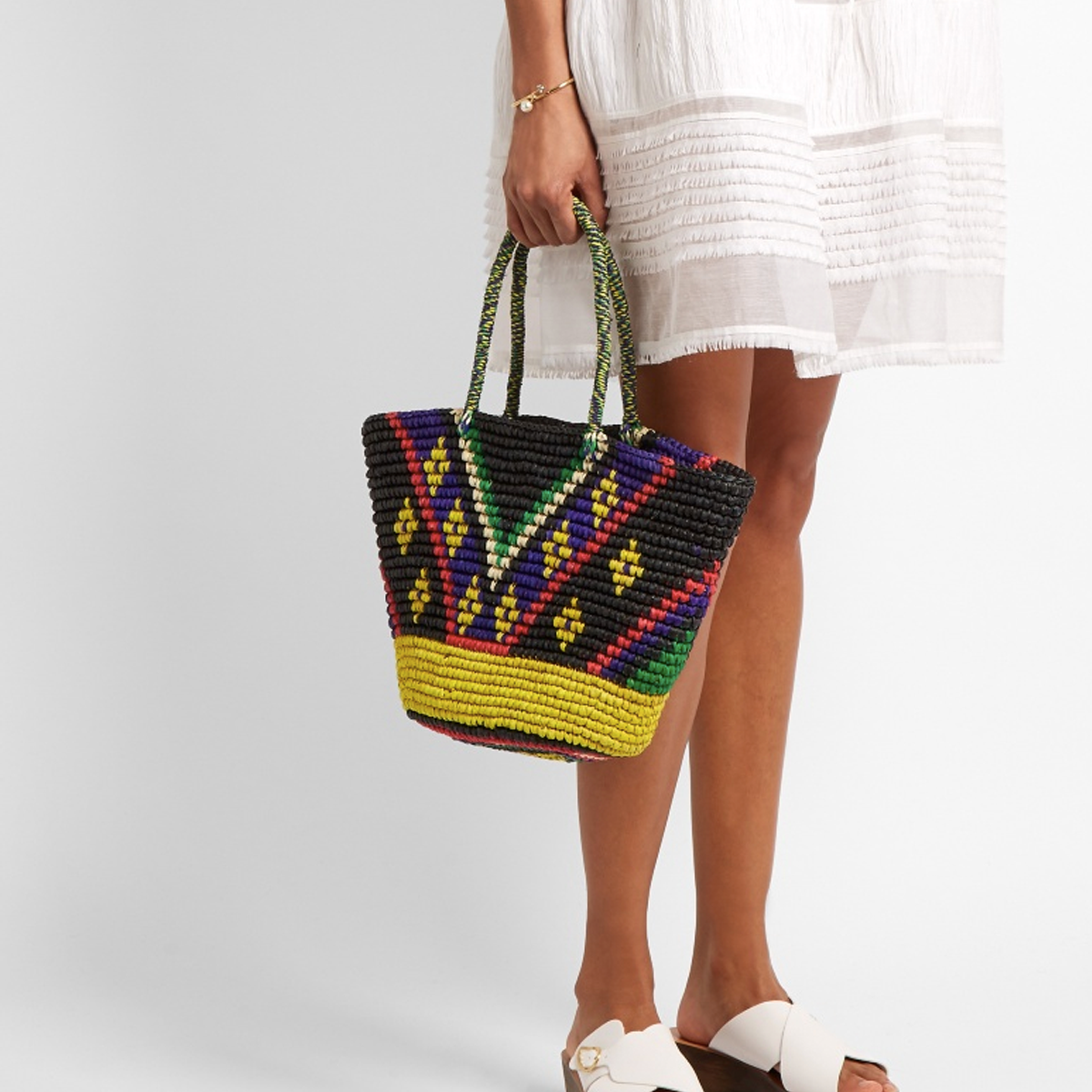 We love the dark, tribal pattern on this handy basket tote. Wear it from beach to city.