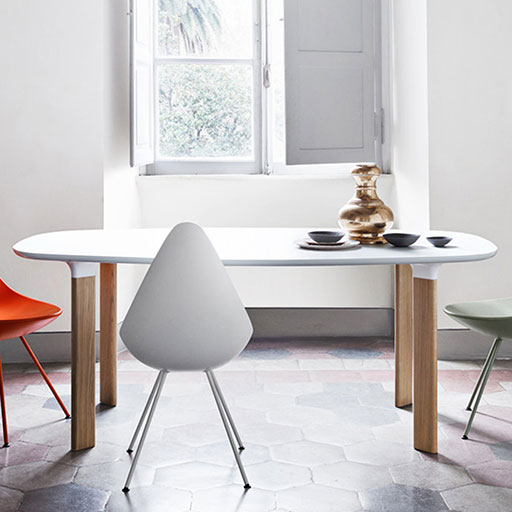 This ABS-plastic chair was unearthed from the archives of celebrated Danish designer Arne Jacobsen after more than 50 years out of production. In a choice of six colours: red, white, black, sand, blue or grey.