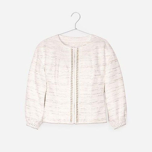 This tweed-style Ibility jacket, complete with chain detailing, comes in cream or grey. Throw it on to add a ladylike touch to your everyday wardrobe.