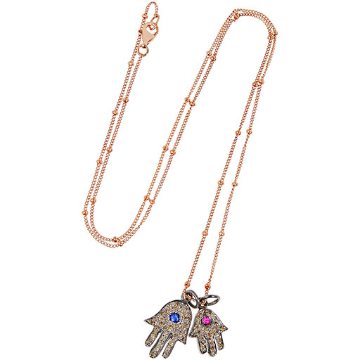 This pretty pendant necklace from Ileana Makri’s diffusion IAM line features two Fatima hands as lucky charms. Each is encrusted with grey diamonds, complete with a ruby or sapphire centre and with a contrasting rose-gold chain. A bit bohemian, extremely feminine and easy to wear, this is one piece that’s sure to please.