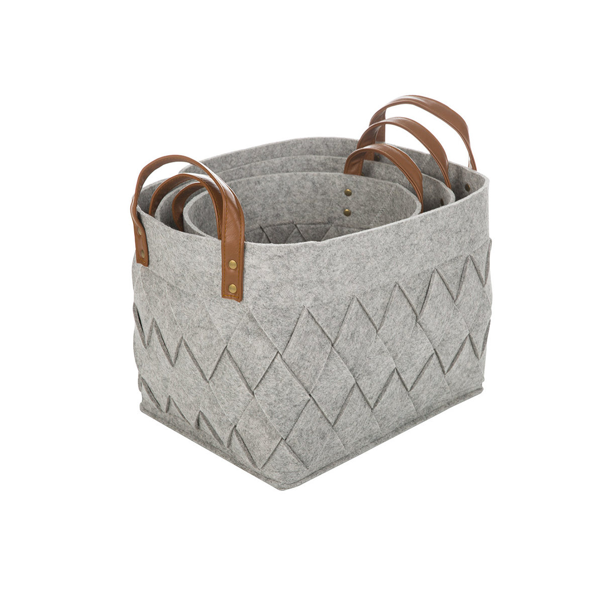 Grey felt baskets A by Amara AU$146.00 These grey felt baskets are a great way to store your stuff in style. They come in a set of 3, and they're finished with leather handles. Share: Tags: Design, Home,