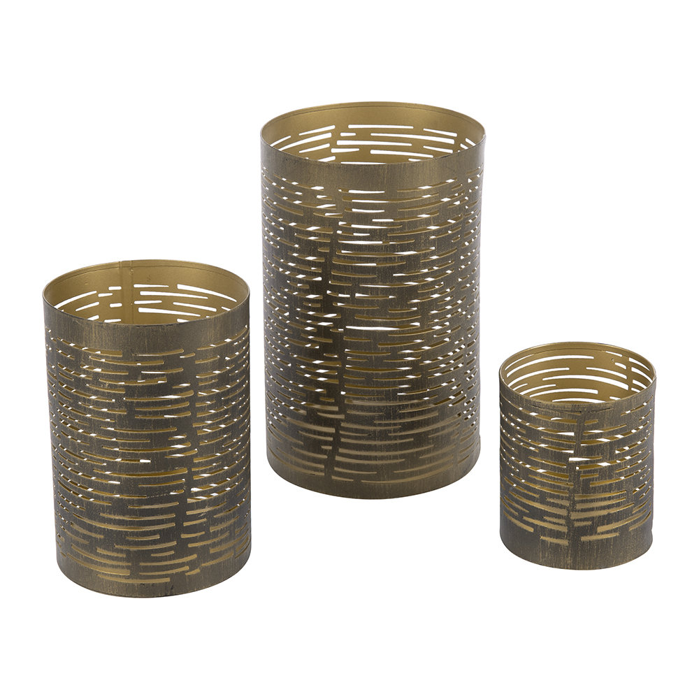 Order online this set of 3 tea light holders that create a soft atmosphere in any room. The alternating sizes are also available in a green/gold colour.