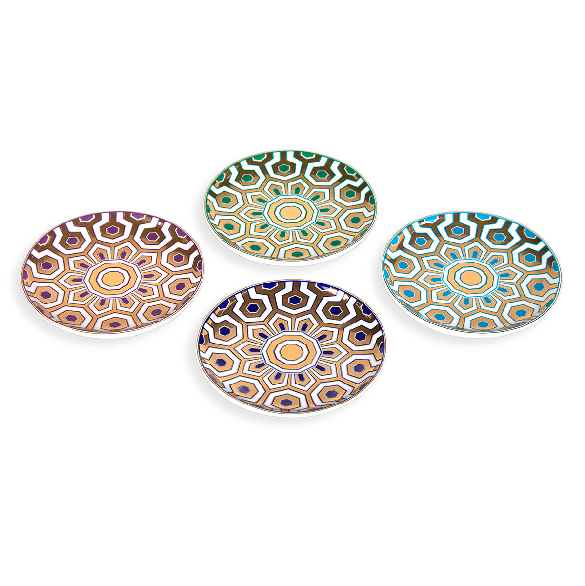 Jonathan Adler’s porcelain coasters are a luscious party accent – these exuberantly hued coasters are even finished in 24-carat gold.