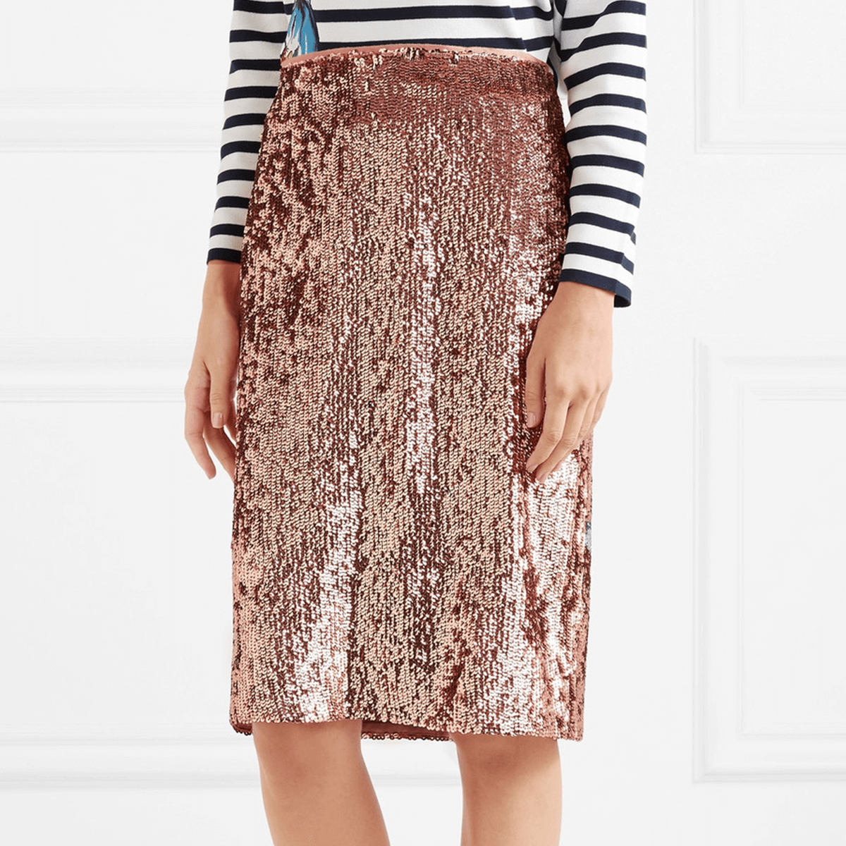 The pioneers of the sequins by day look, J Crew know good shine. Wear this rose gold skirt with clashing sweaters for a kooky take on daytime dressing and switch it up with a simple, silk cami by evening.