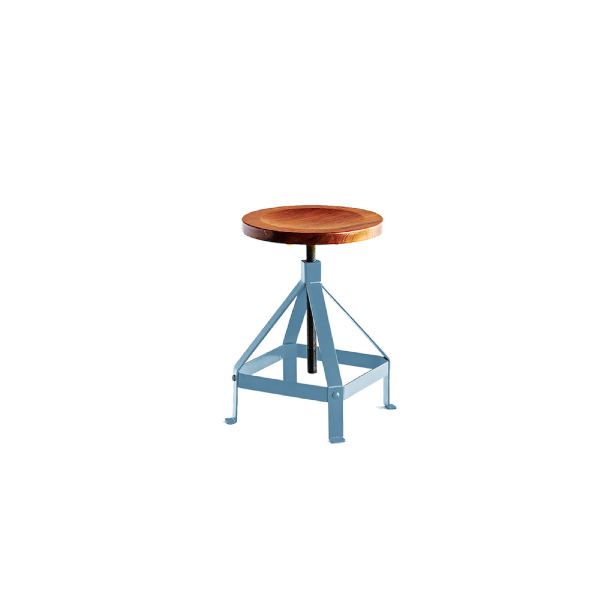 With its metal base and solid teak seat, the adjustable Suzy stool appeals to our inner industrialist. The base can be finished in blue, red, yellow, black or white.